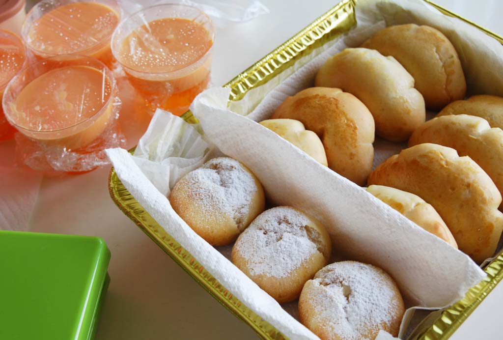 ↑差し入れでいただいた、手作りクリームパン&チーズパン、オレンジゼリー。