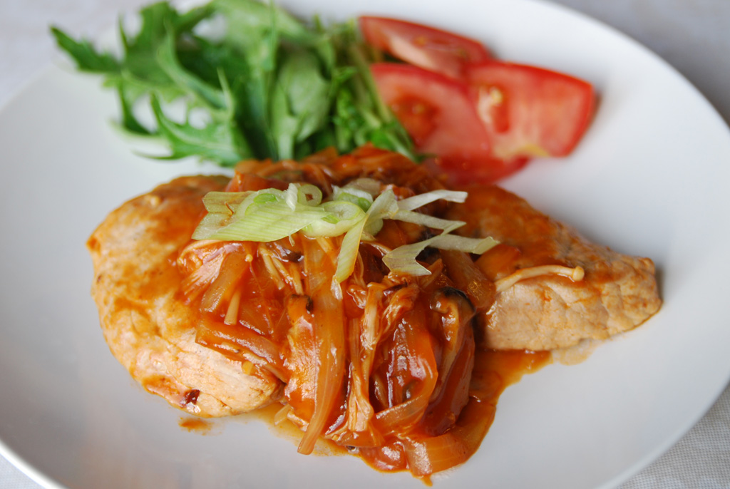 ・フライパンを洗わずに、玉ねぎときのこ類を炒め、酒、ケチャップ、砂糖、醤油を加えて味を整える。この時、「少し薄いかな?」ってぐらいで。