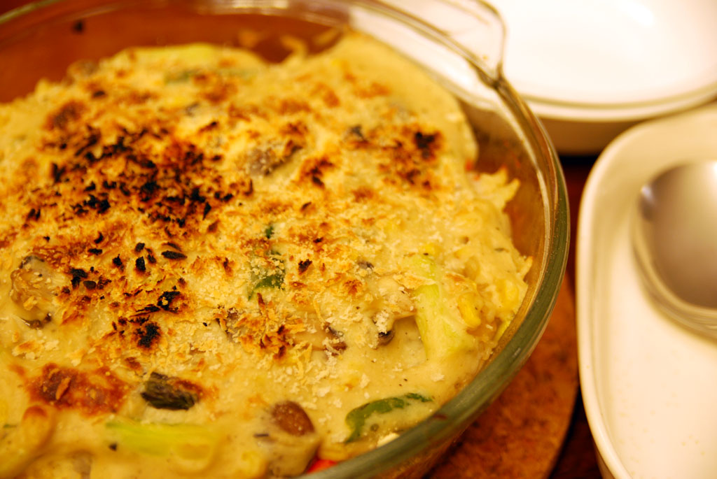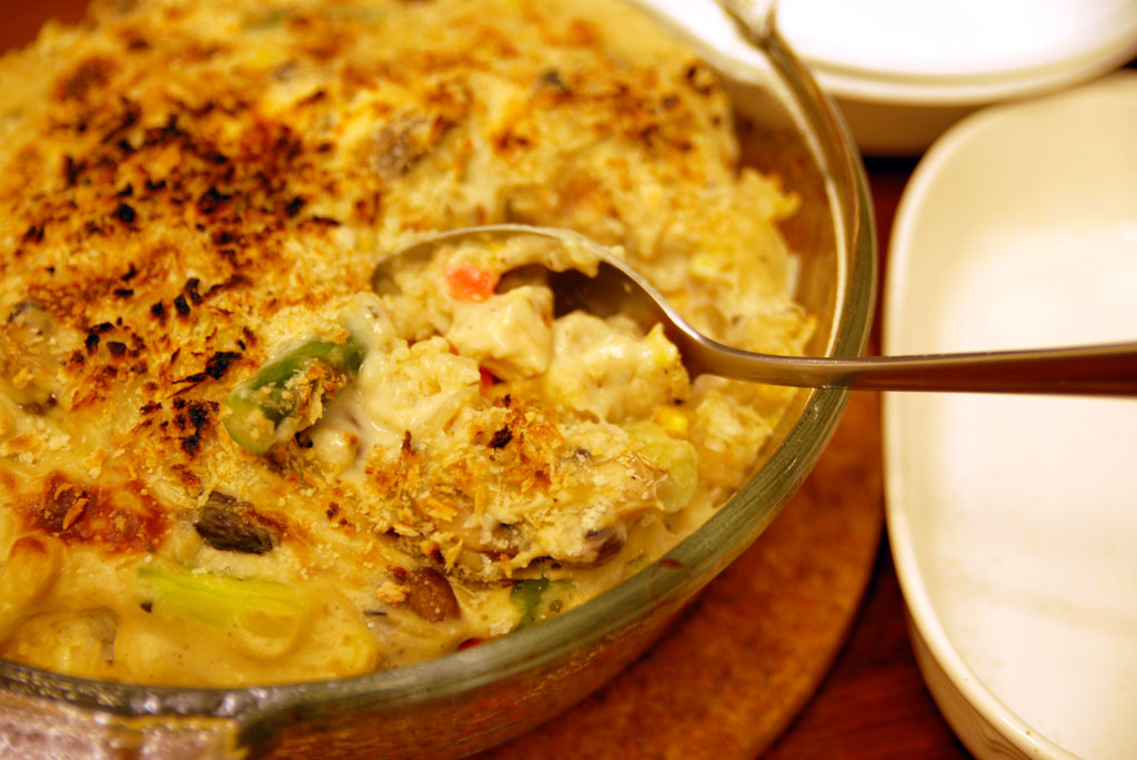 ・耐熱容器のごはんにかけて、表面にパン粉少々と粉チーズ少々をふりかけてオーブンのブロイルで焦げ目をつける。