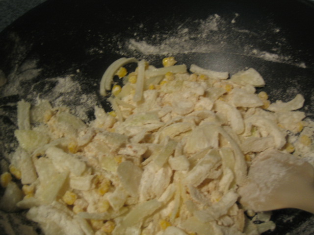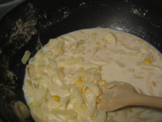 ・薄切りの玉ねぎとコーンをバターで炒める。