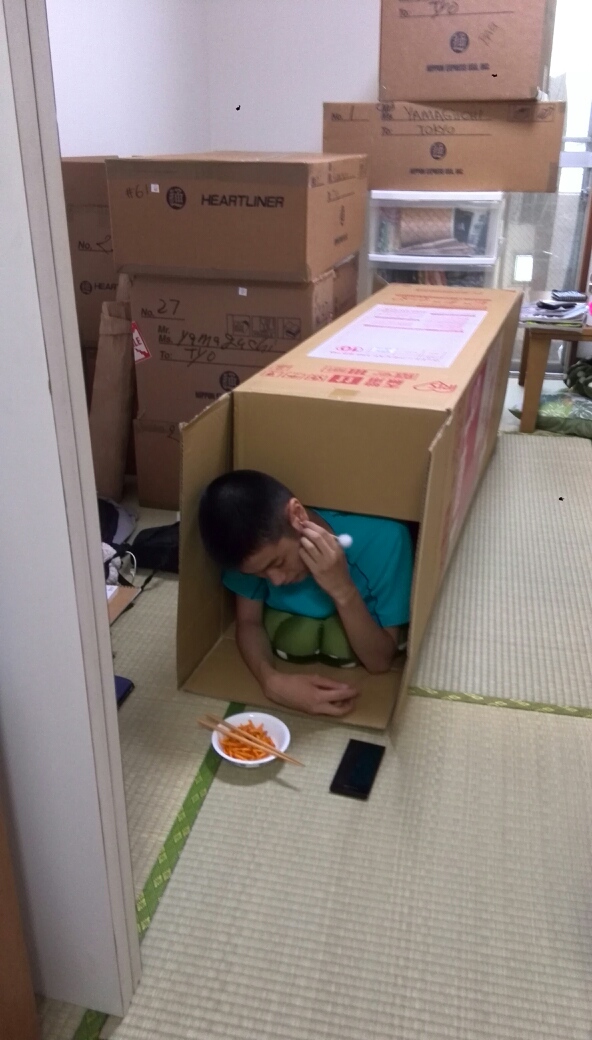 ↑空いた段ボール箱で巣を作って、ホボごっこだって。