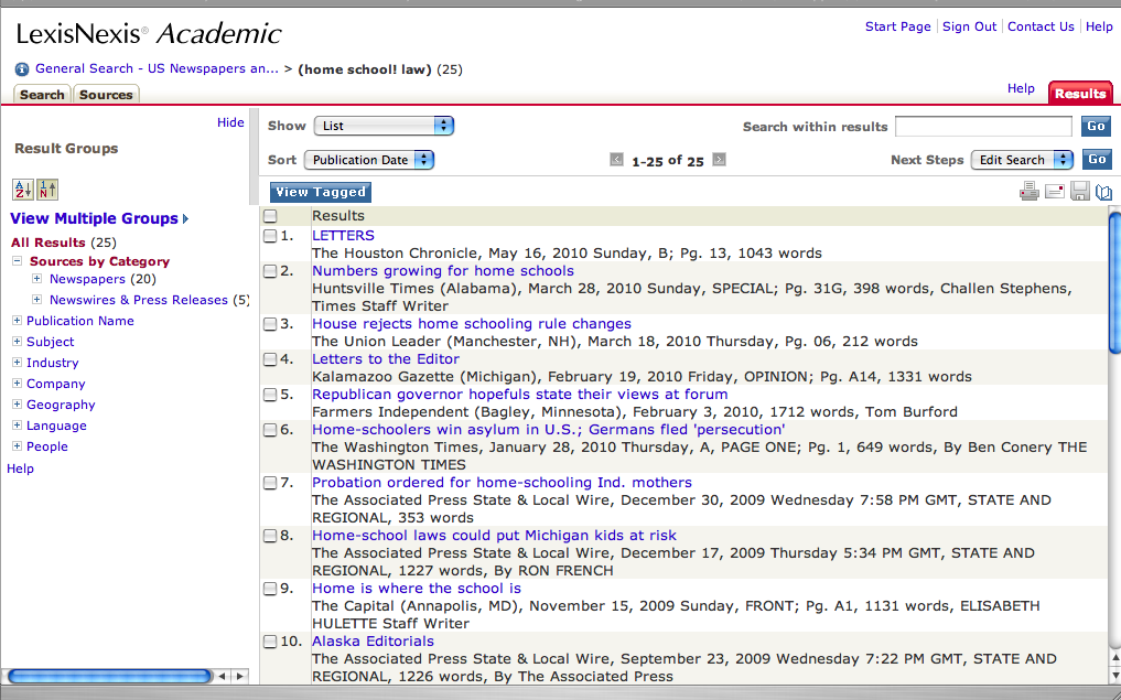『home school! law』というワードで、過去2年以内の米国内メジャー新聞とテレビ&ラジオ放送を検索した結果。