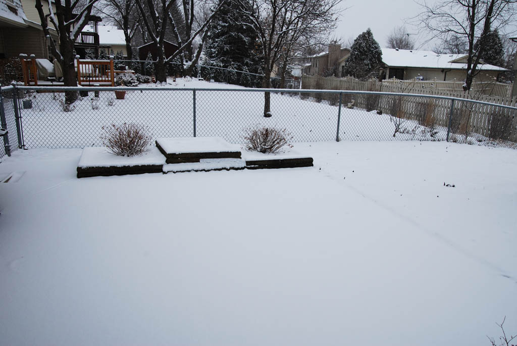 先週10℃まで気温が上がってすっかり雪が融け、その後も暖かかったので(っていっても2、3℃)しばらく芝生の庭だったのですが、一晩で再びこんもり。