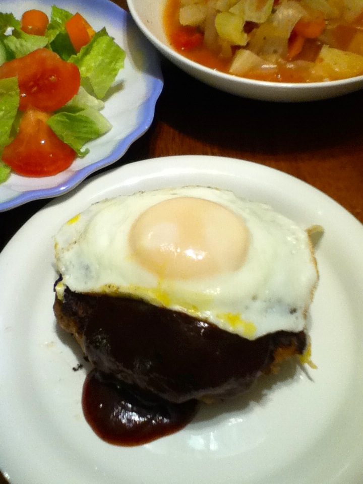 チーズ入りハンバーグ目玉焼き載せ、サラダ、ミネストローネ。