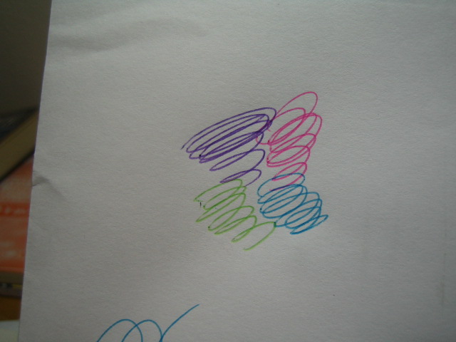 じつは以前、某ネズミーランド南カリフォルニア支店の土産物店で、黒、水色、緑、ピンクの4色ボールペンを購入したんですけど、こちらはインクドボドボなくせに書けたり書けなかったり。