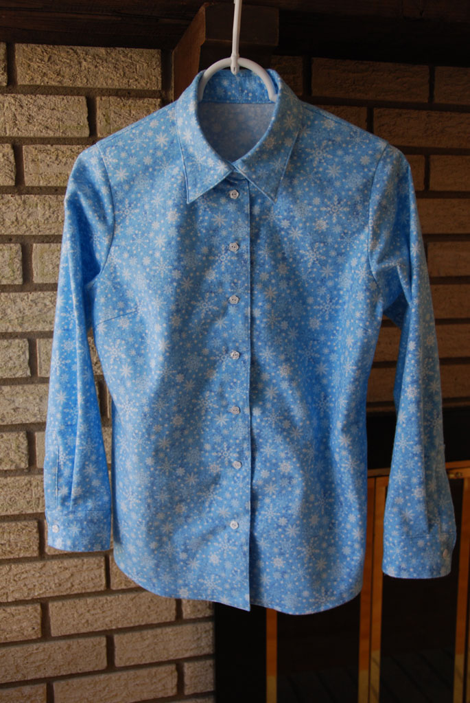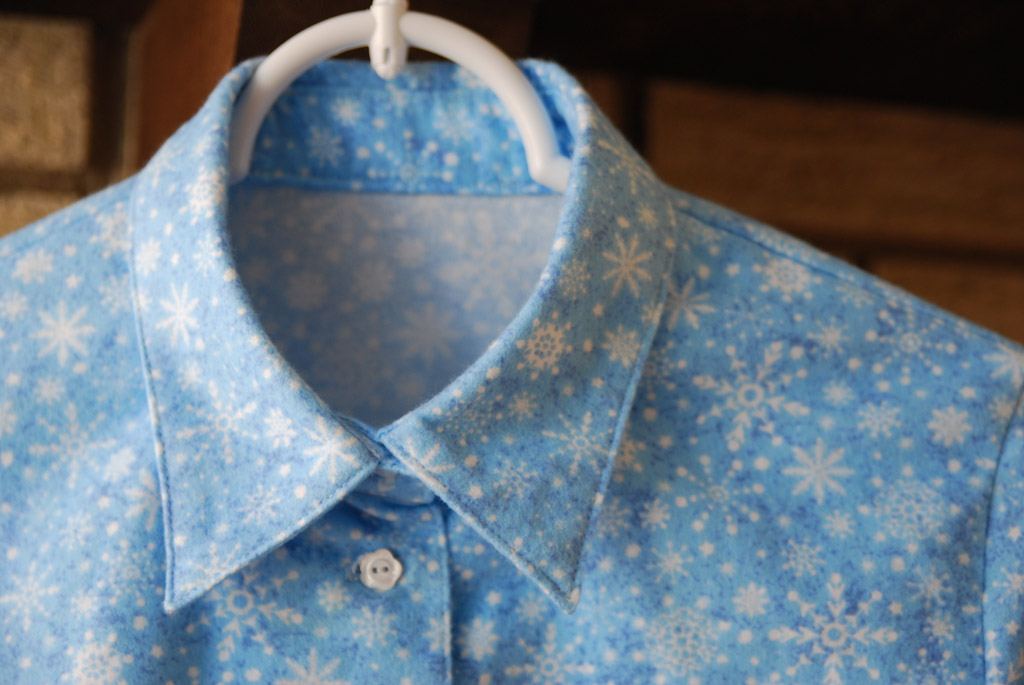 綺麗なブルー地に雪の結晶柄の綿ネルを見つけたので、娘用にシャツを作りました。