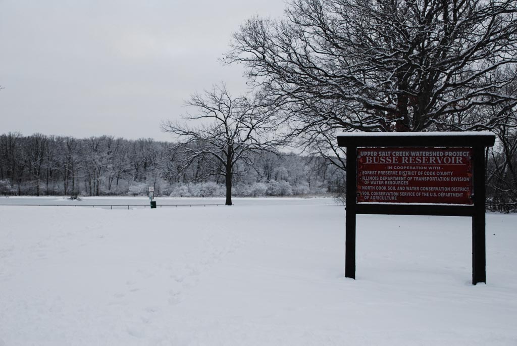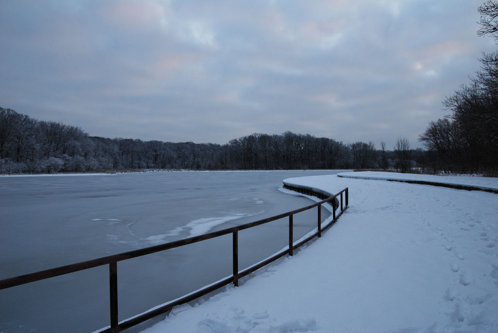 ↑凍結した早朝の小さな湖。